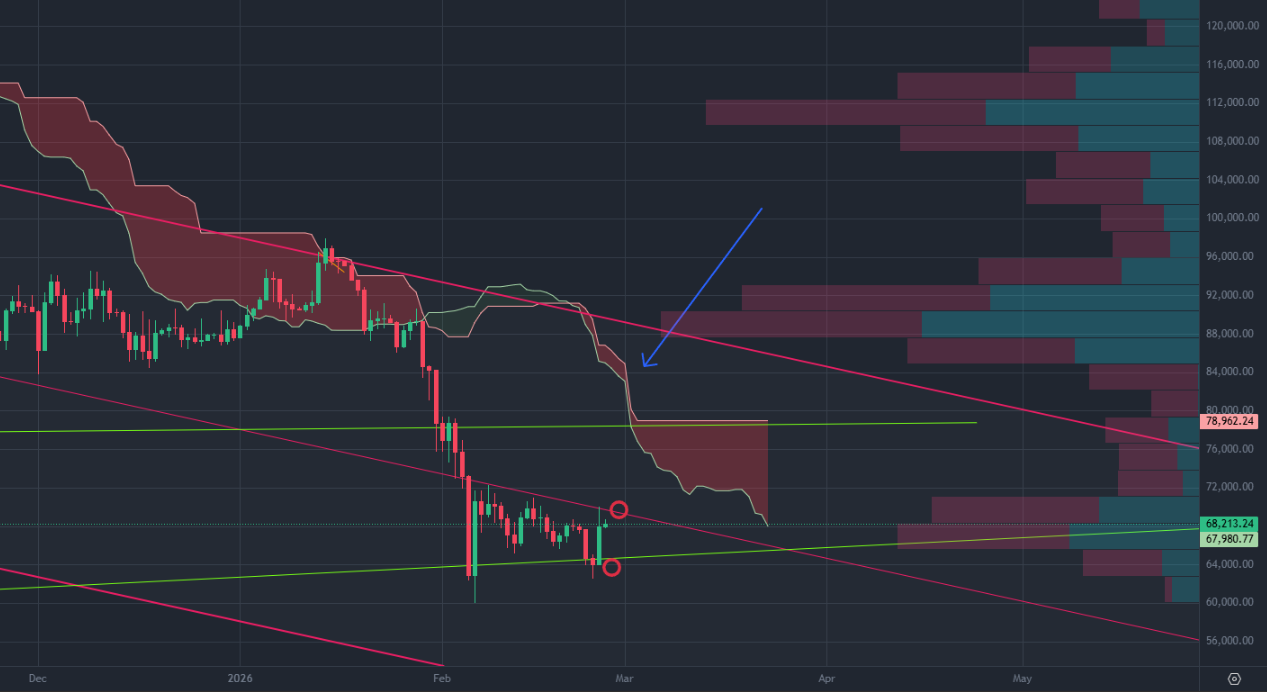 1. 69.5k 위를 강력하게 뚫거나, 혹은 4시간봉 몸통으로 이탈마감시 롱포지션 장투 유리해보임