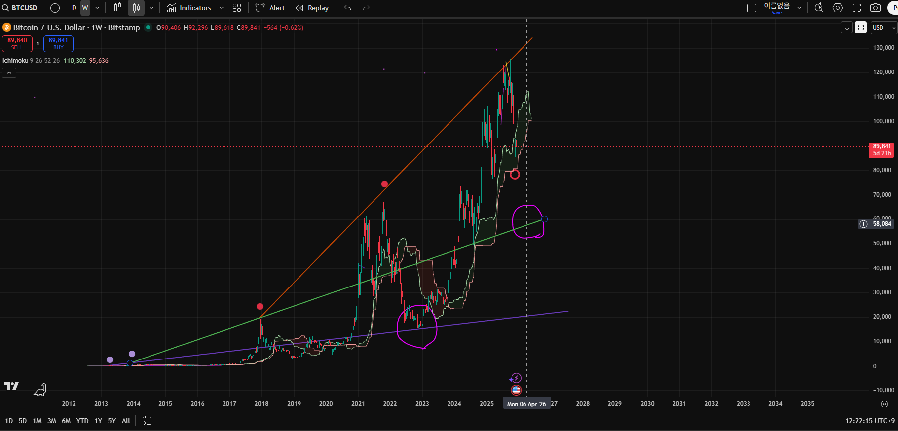 매시즌 불장 고점 두개를 이으면 놀랍도록 최저점 예측이 가능한데,