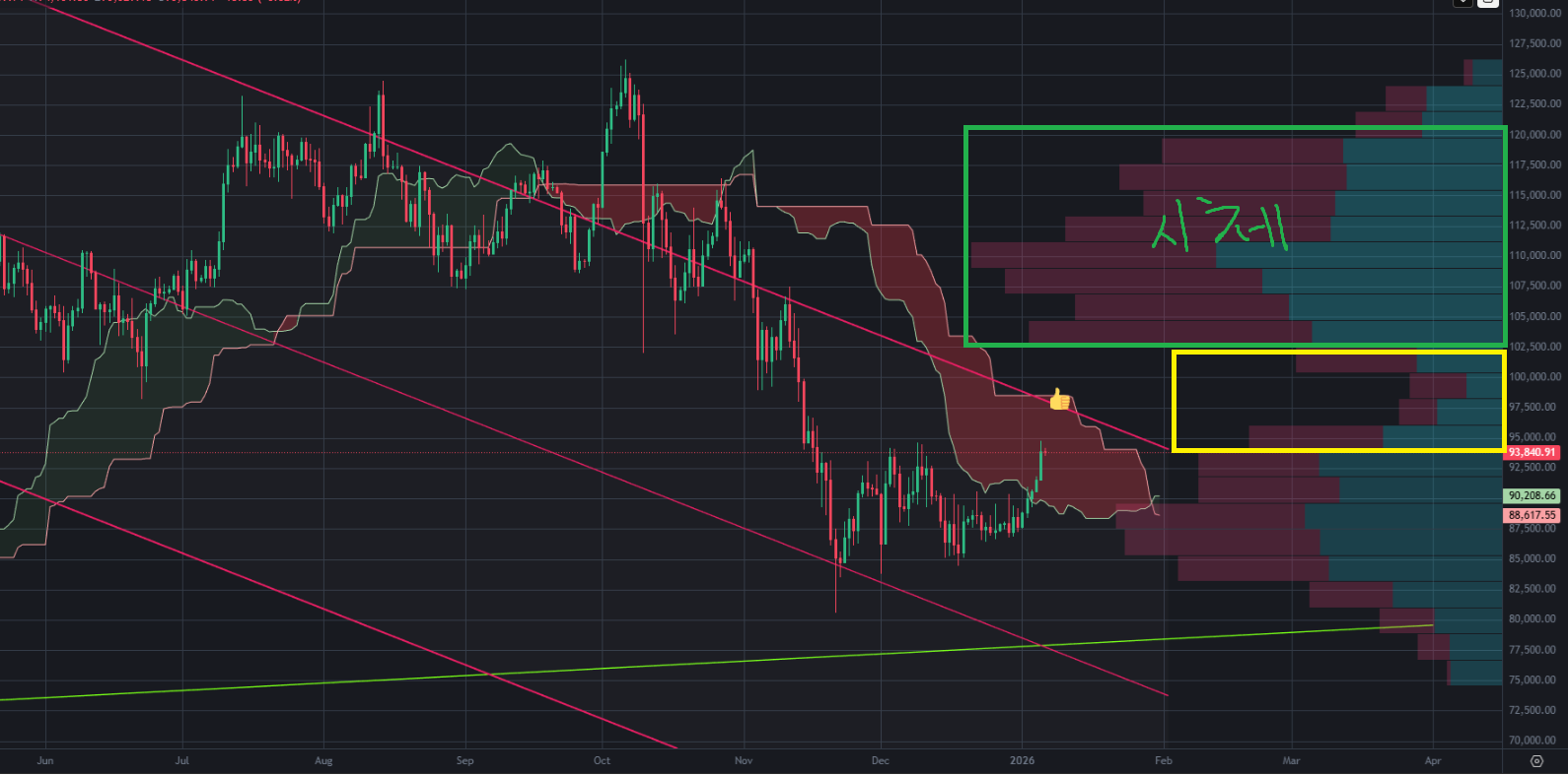 저의 경우 97k 위에 안착하면 빗각을 밟는 자리에서 롱포지션을 101k까지 끌고 갈것이며,