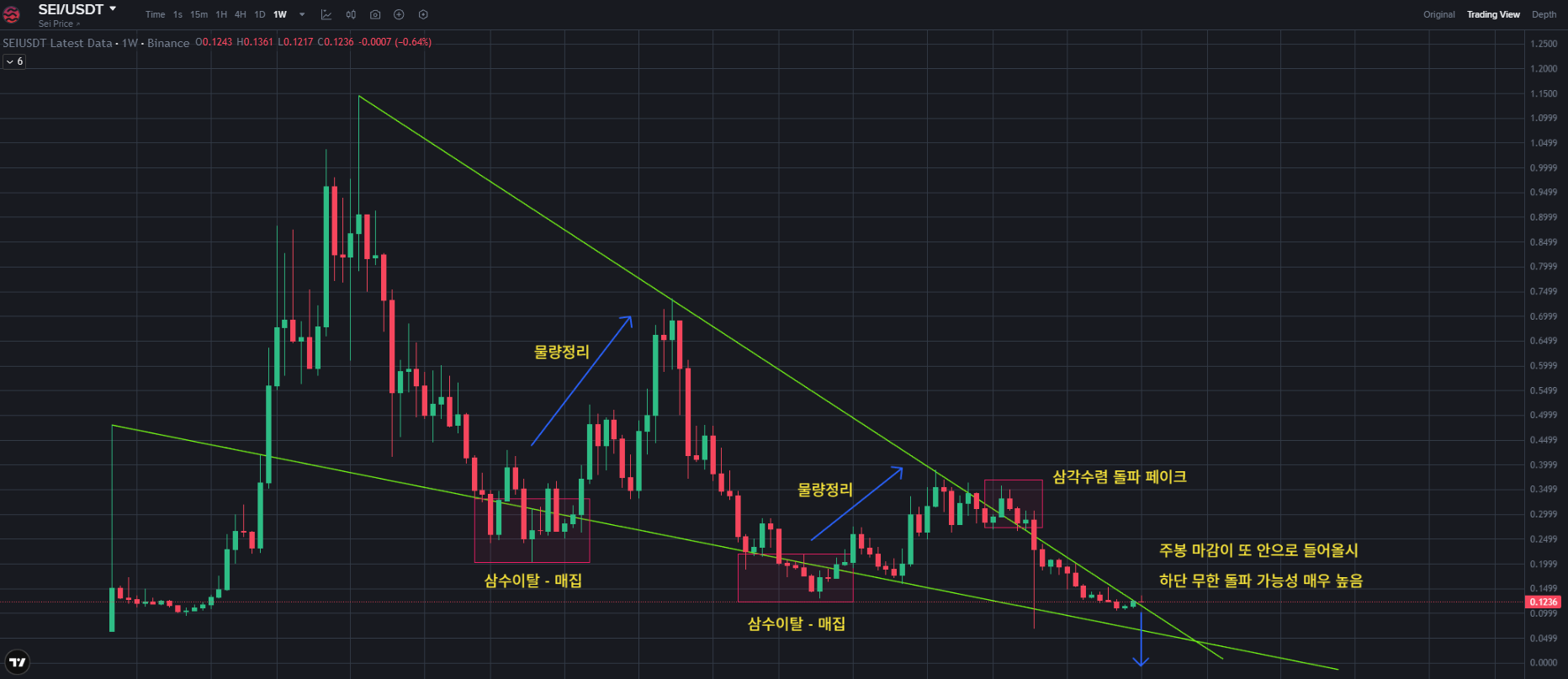 먼저 아주 큰 삼각수렴 형태 안에서 놀고 있는데 보이는데 세력의 의도가 명확하게 보이는 차트는 '세이'가 유일합니다