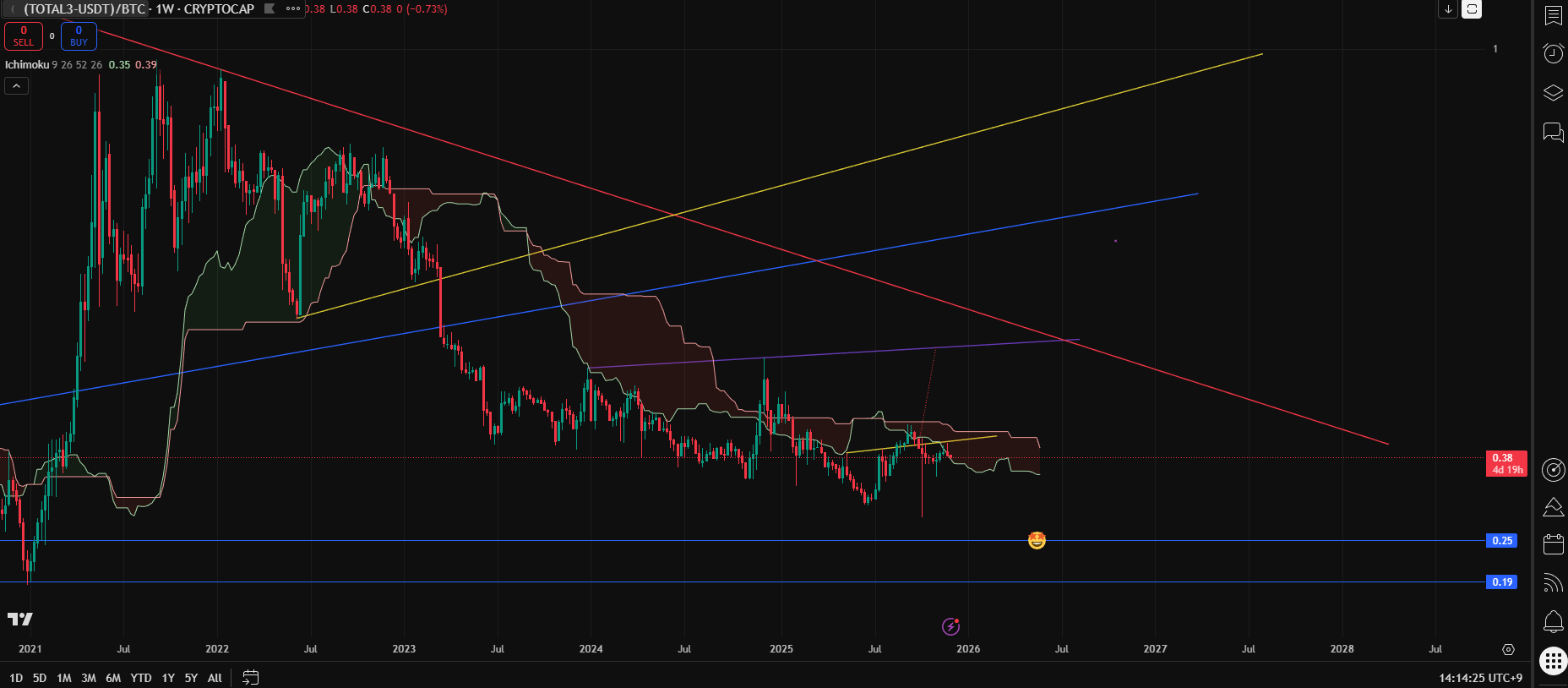 비트코인 대비 다른 알트코인의 시가총액 비중을 나타내는 토탈3 차트다.
