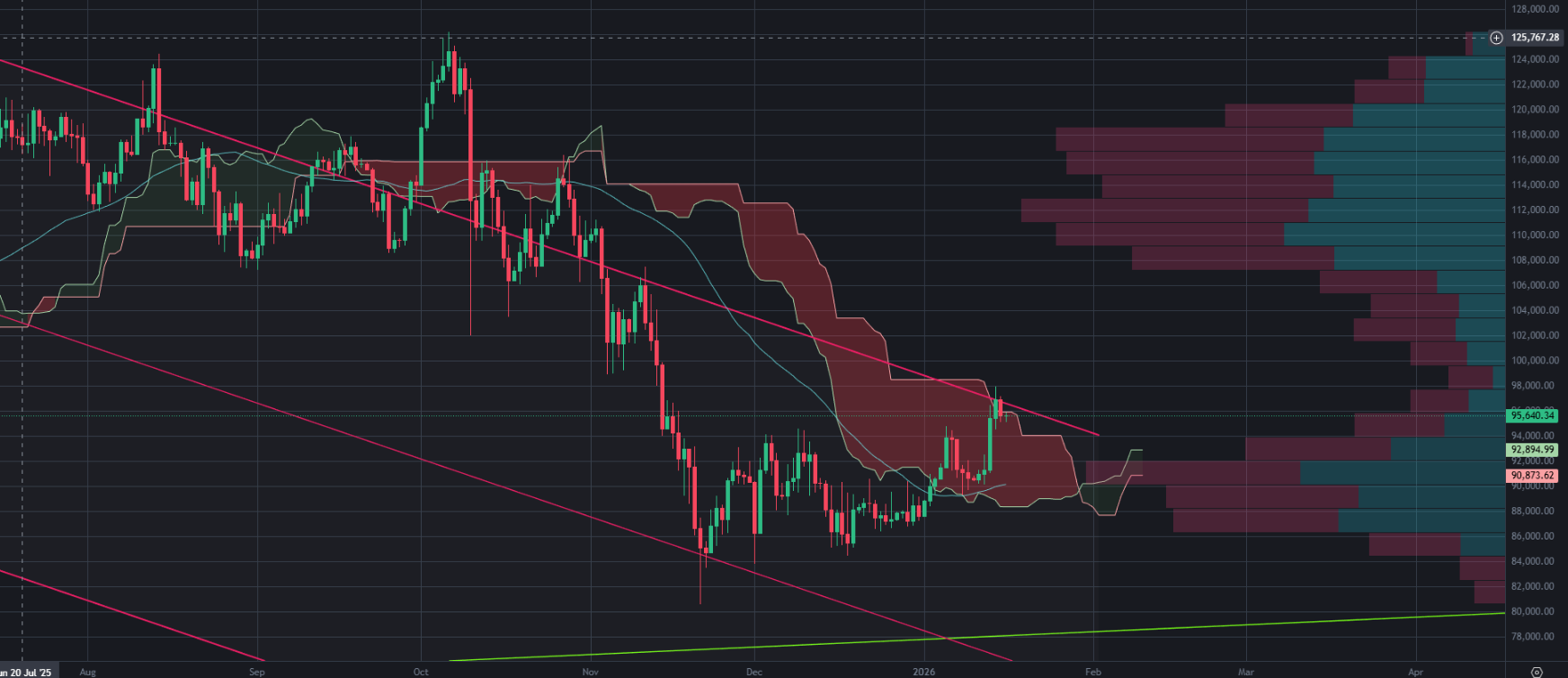 해당 97k를 일봉 몸통으로 뚫고나면 선을 다시 한번 밟고 갈텐데 그때는 롱 포지션에 진입할 계획입니다.
