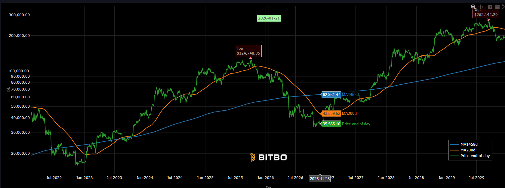 차트에 따르면 2026년 10월경 최저점은 약 35k 부근일것이라고 합니다.
