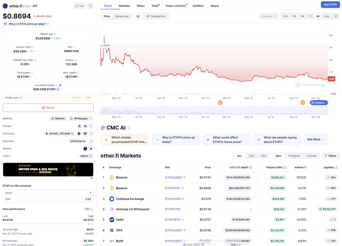 ETHFI는 공급량 10억 개로 제한됐지만, 2026년까지 투자자 및 기여자에 대한 언락은 계속됨.