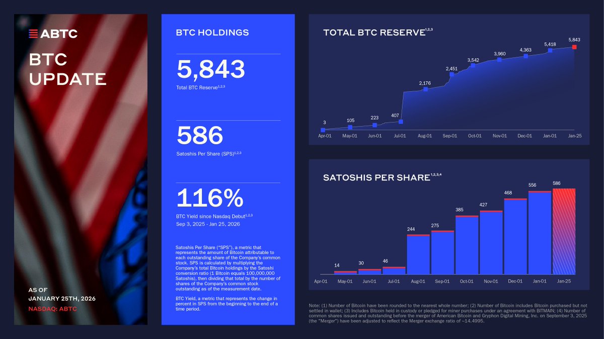 American Bitcoin이 총 비트코인 보유량을 ~5,843 BTC로 늘렸고, 나스닥 상장 첫날인 2025년 9월 3일부터 2026년 1월 25일까지 BTC 수익률 ~116%를 기록했다.