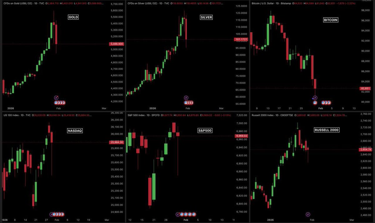 단 하루 만에 금속, 주식, 코인에서 6.5조 달러 넘게 증발함.