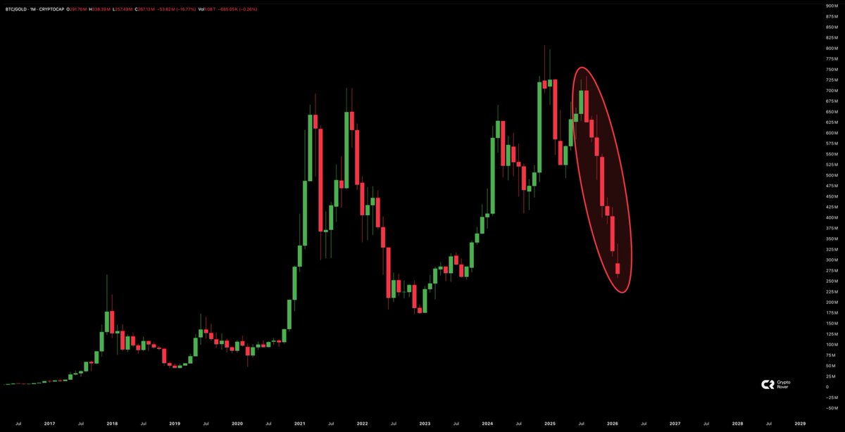 금 대비 비트코인, 7개월 연속 음봉. 이런 연속 기록은 사상 처음이다.
