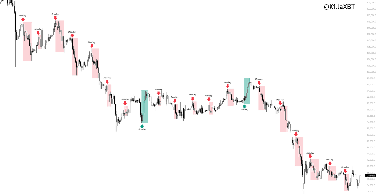 최근 20번의 월요일 중 18번은 비트가 3% 이상 빠졌음. 지난 5개월 동안 월요일이 로컬 바닥 찍은 건 고작 2번.