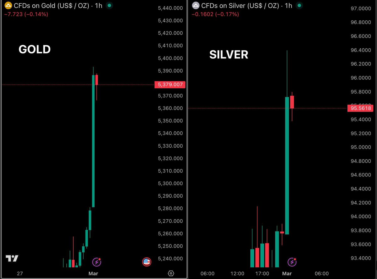 장 열리고 60분 만에 금·은 시총이 8620억 달러나 늘어남.