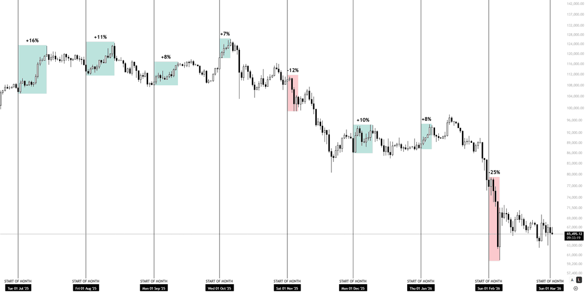 새 월초 시가 2시간 전 중립적 12 0 0 지난 6~8개월간 BTC는 새 월초 시가 이후 평균 6~7% 정도 상승하는 흐름을 보여왔다.새 월초 시가 이후에 큰 하락이 나온 건 시장이 이미 대세 추세 전환 직전이었을 때뿐이었다. 스크랩 0 공유 관련링크 https://twitter.com/KillaXBT/status/2028478832760504460