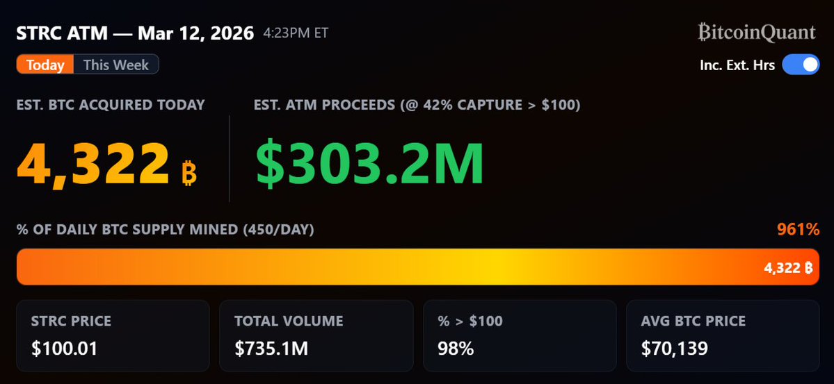 ์ง€๋‚œ์ฃผ MSTR/STRC ๋ฐœํ–‰ ๋น„์œจ๋กœ ์˜ค๋Š˜๋„ ๋˜‘๊ฐ™์ด ํ•œ๋‹ค๊ณ  ์น˜๋ฉด, MSTR์—์„œ ์˜ค๋Š˜ ํ•˜๋ฃจ๋งŒ 7์–ต 2,786๋งŒ ๋‹ฌ๋Ÿฌ๋ฅผ ๋ชจ์€ ๊ฑฐ์•ผ.
