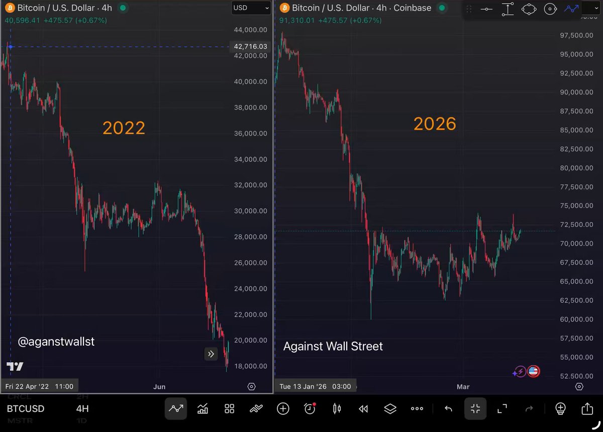 비트코인이 아직도 2022년이랑 파동 하나하나 그대로 따라가는 중. 좀 소름이지? 😱 이제 곧 역사가 반복되는지 판가름 난다.