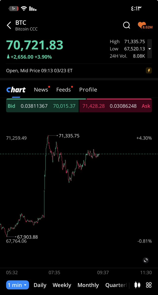 전쟁 끝나고 비트코인 7.1만 달러 복귀 ‼️ N 4천불 급등. 거래량 8천뿐 🤯🙀 IBIT 3% 하락에서 1% 상승 전환 기억해라, 비트코인은 전고점 회복하고 신고점 또 간다. 인류가 경험한 최고의 투자다. BTC 1시간 전 중립적 2 0 0