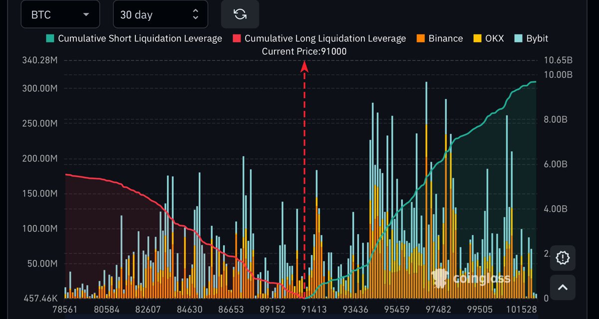 속보: BTC가 9만3천 달러까지 펌핑하면 약 10억 달러 규모의 숏 포지션이 청산된다.