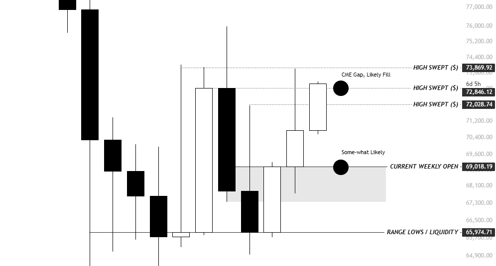 CME 레벨 아래에 머물면 69K 쪽으로 다시 눌릴 공산이 큼. 반대로 CME 갭을 지지로 전환(플립)하면 74–75K 재고점 + 외부 레인지 하이까지 열림.