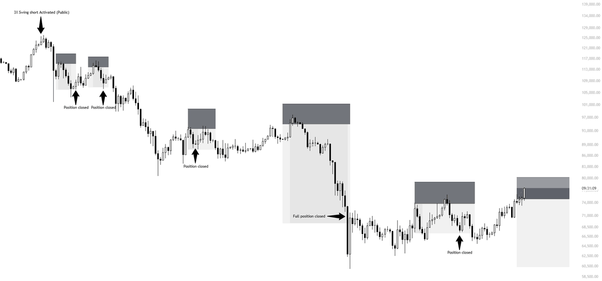 현재 포지션은 그대로 스윙 숏, 인발리데이션은 주봉 80K 상방 마감(SSL).