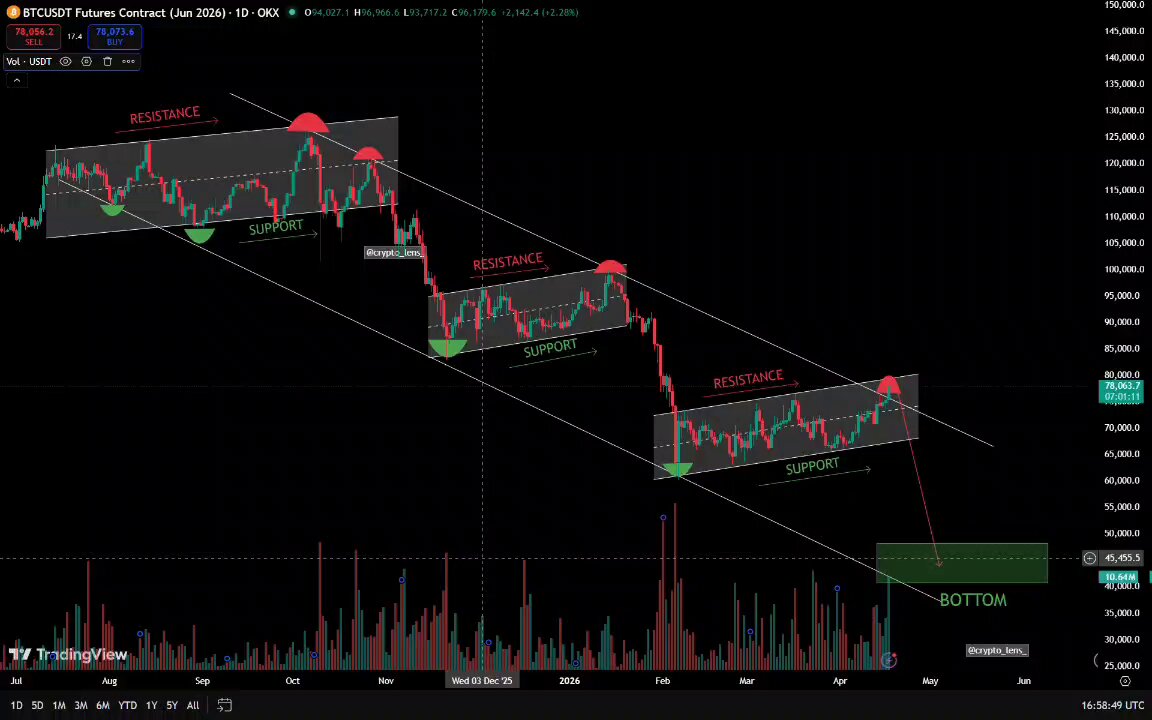 BTC, 지금 $79,500 리젝션 구간을 정면으로 치고 들어가는 중. N 다음 주엔 저항이 지지로 전환되고 $BTC는 $44,000~$38,000 구간까지 덤프 날 거다. 늦기 전에 이 차트 북마크해둬라. 44분 전 중립적 5 0 0