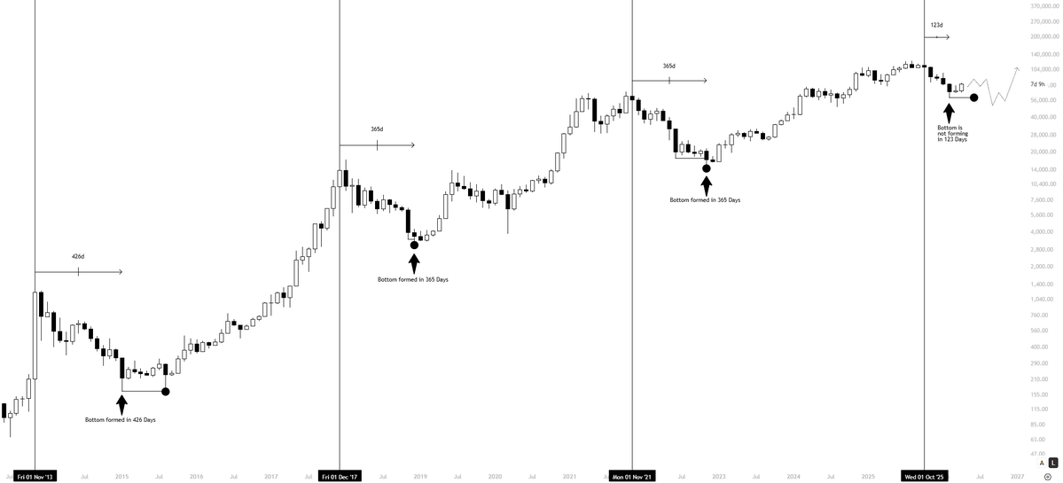모든 베어 사이클은 더 올라가기 전에 이전 저점을 다시 찍거나 스윕했음. 즉 역사적 데이터상 앞으로 몇 달 안에 60K 스윕할 가능성은 여전히 충분함.