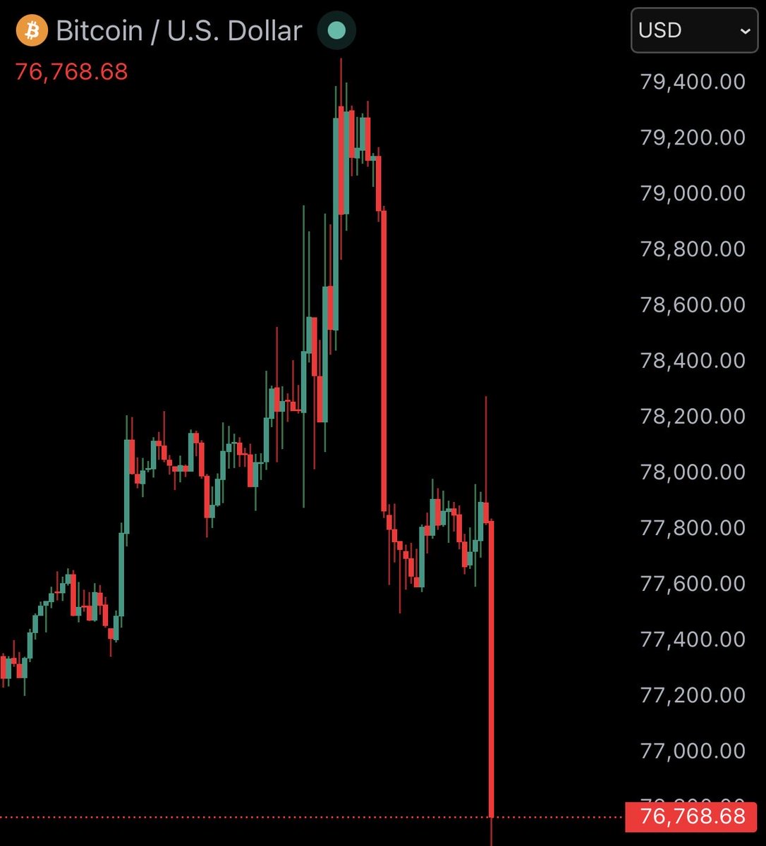 🚨 속보: 비트코인 방금 플래시 크래시로 7만7,500달러까지 찍음. N 지난 1시간 새 롱 포지션만 6,800만 달러 강제청산. 전체 크립토 시총에서 410억 달러 증발, BTC 혼자 270억 달러 날림. 뚜렷한 악재나 헤드라인 없음. 6시간 전 부정적 14 0 0