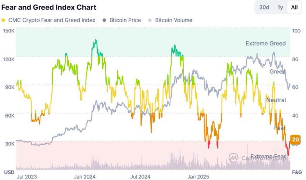 공포·탐욕 지수가 다시 극단적 공포로 돌아왔네. 13시간 전 중립적 20 1 1 #비트코인은 보통 심리가 이 정도로 나빠지면 바닥 찍더라 👀이 구간 유심히 보고 있냐? 스크랩 1 공유 관련링크 https://twitter.com/Eljaboom/status/2000322136070877515
