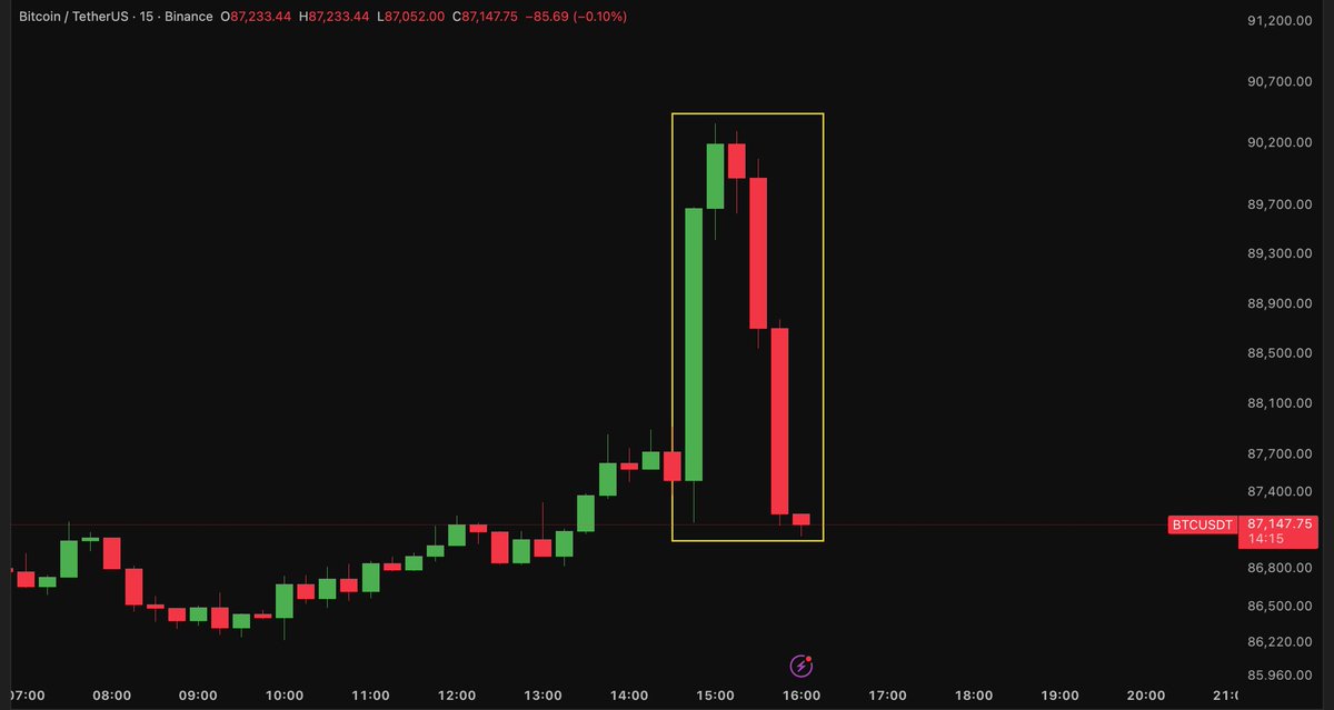 ์˜ค์ „ 9์‹œ 30๋ถ„ ๋ฏธ์žฅ ๊ฐœ์žฅ - ๋น„ํŠธ์ฝ”์ธ 30๋ถ„ ๋งŒ์— $87,500 โ†’ $90,365, 2,865๋‹ฌ๋Ÿฌ ๊ธ‰๋“ฑ - ์ „์ฒด ์ฝ”์ธ ์‹œ์ด ์•ฝ 800์–ต ๋‹ฌ๋Ÿฌ ์ฆ๊ฐ€ - 30๋ถ„ ์‚ฌ์ด ์ˆ ์•ฝ 1์–ต 600๋งŒ ๋‹ฌ๋Ÿฌ ์ฒญ์‚ฐ ์˜ค์ „ 10์‹œ ์กฐ์ž‘ ์‹œ์ž‘ - ๋‹ค์Œ 90๋ถ„ ๋™์•ˆ ๋น„ํŠธ์ฝ”์ธ $90,365 โ†’ $86,300, 4,000๋‹ฌ๋Ÿฌ ๊ธ‰๋ฝ - ์ „์ฒด ์‹œ์ด์—์„œ ์•ฝ 1,300์–ต ๋‹ฌ๋Ÿฌ ์ฆ๋ฐœ - 1์‹œ๊ฐ„ ๋™์•ˆ ๋กฑ ์•ฝ 1์–ต 5์ฒœ๋งŒ ๋‹ฌ๋Ÿฌ ์ฒญ์‚ฐ ๋˜‘๊ฐ™์€ ํŒจํ„ด. ๋˜‘๊ฐ™์€ ํƒ€์ด๋ฐ.