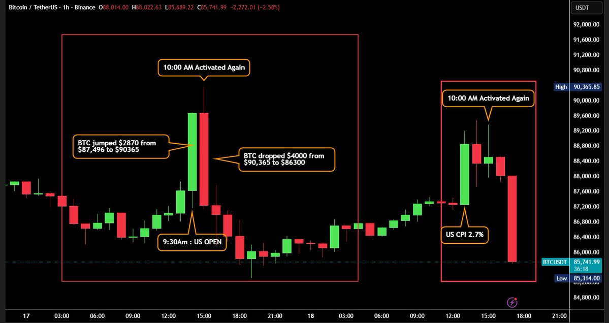 - ๋ค์ 90๋ถ ๋์ ๋นํธ์ฝ์ธ์ด $89,363 โ $85,640๋ก $3,723 ๊ธ๋ฝ.
