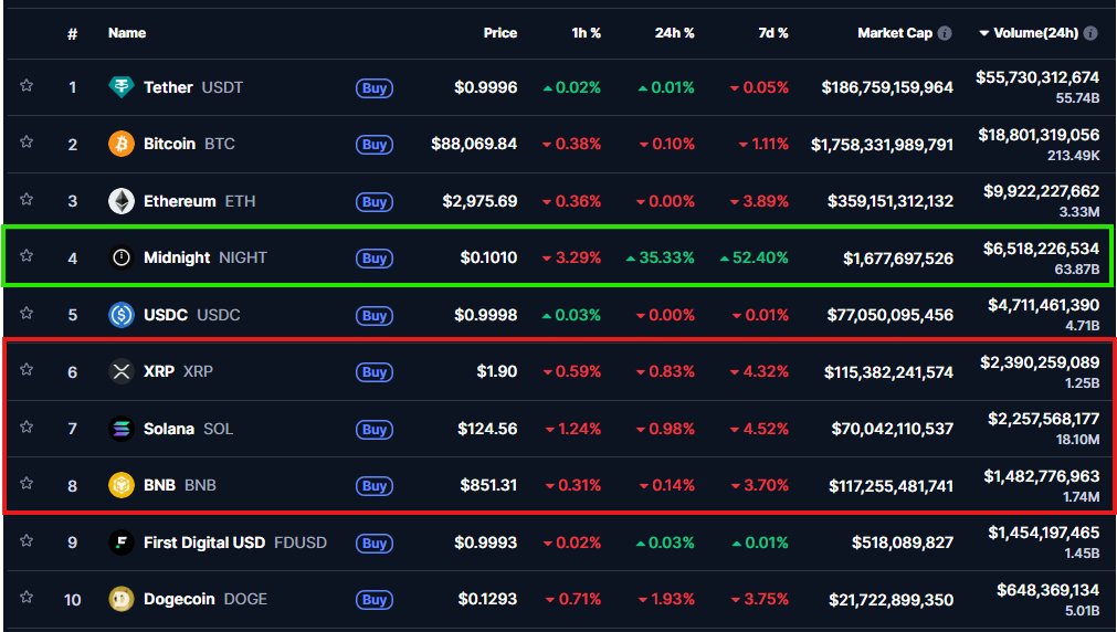 지난 24시간 기준, NIGHT 거래량이 XRP, SOL, BNB 합친 것보다 더 많음 🤯