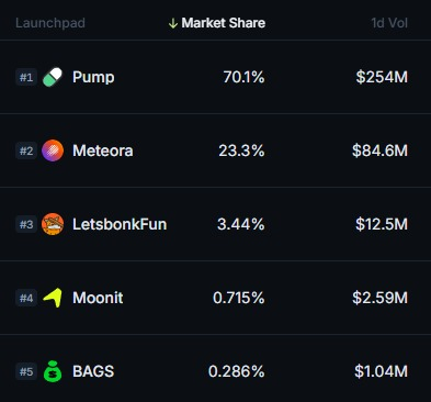 시장점유율 기준 밈코인 런치패드 TOP 5: N PumpFun — 70.1% Meteora DBC — 23.3% LetsBonkFun — 3.44% Moonit — 0.715% Bags — 0.286% 1시간 전 중립적 5 0 0