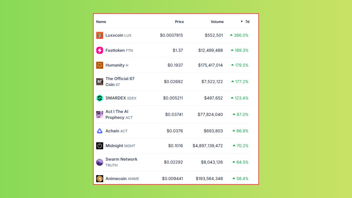 $LUX가 선두를 달리는 중이지만, $NIGHT가 리스트 중 거래량이 가장 높아서 여기선 숨은 보석일 듯.