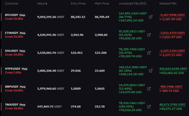 BTC, ETH, SOL, HYPE, XRP, TAO.