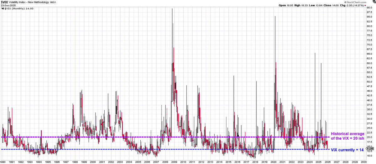 VIX 1990년 도입 이후 범위의 하단 근처.