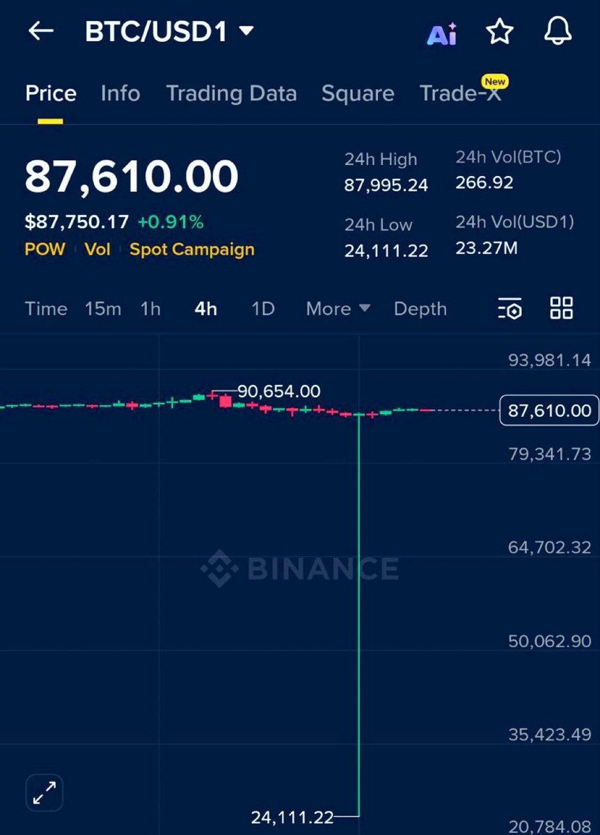 속보: 바이낸스 BTC/USD1 페어에서 크리스마스 당일 갑작스러운 플래시 크래시 발생, 비트코인이 2만 5천 달러 밑으로 급락.