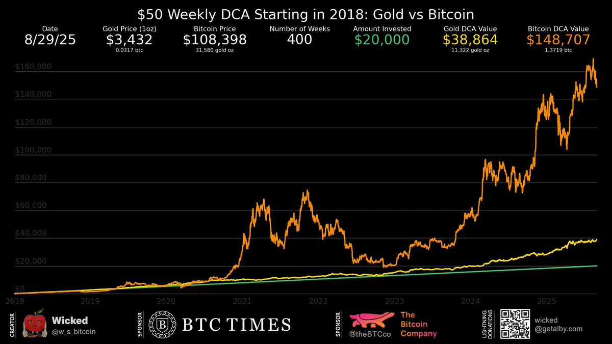 400주 동안 매주 50달러 DCA한 결과… N - 현금: $20,000 - 금: $38,864 - 비트코인: $148,707 이래서 난 비트코인을 계속 모은다. 장기적으로 이길 자산이 없다. 2시간 전 중립적 5 0 0