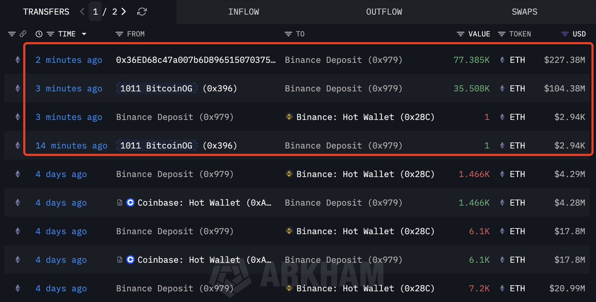 BTC, ETH, $SOL에 7억 4,900만 달러 규모의 대형 롱 포지션을 들고 있는 #BitcoinOG(1011short)이 방금 또 ETH 112,894개(약 3억 3,200만 달러)를 #Binance에 입금함.