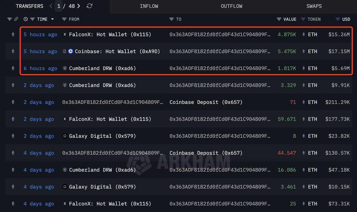 고래/기관이 5시간 전에 코인베이스·FalconX·컴벌랜드에서 ETH 12,166개(약 3,809만 달러어치)를 사들였다.