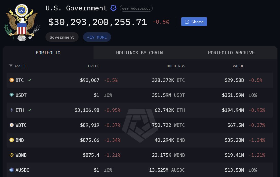 ⚡ 속보: 미국 정부, 현재 암호화폐 300억 달러 이상 보유… 97%가 BTC