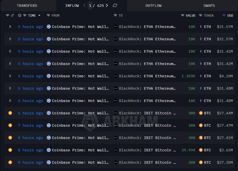 블랙록이 지난 8시간 동안 3,040 BTC(약 2.777억 달러)와 61,359 ETH(약 1.9323억 달러)를 출금했다.