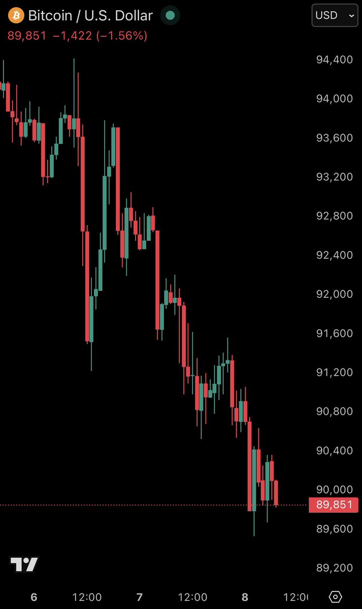 속보: 비트코인, 24시간 동안 레버리지 롱 포지션 4억5천만 달러가 청산되며 9만 달러 아래로 하락.