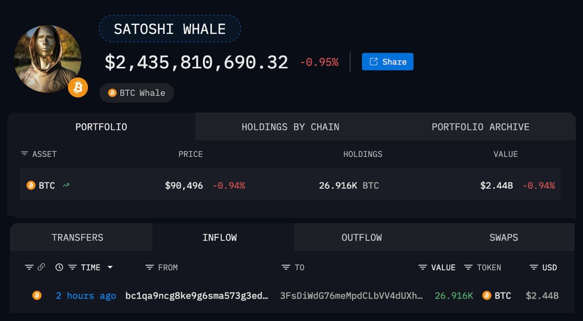 ์ฌํ ์ ์์ ๊ณ ๋๊ฐ ๋ฐฉ๊ธ 26,900 BTC(์ฝ 24.5์ต ๋ฌ๋ฌ์ด์น)๋ฅผ ๋งค์ํ๋ค.