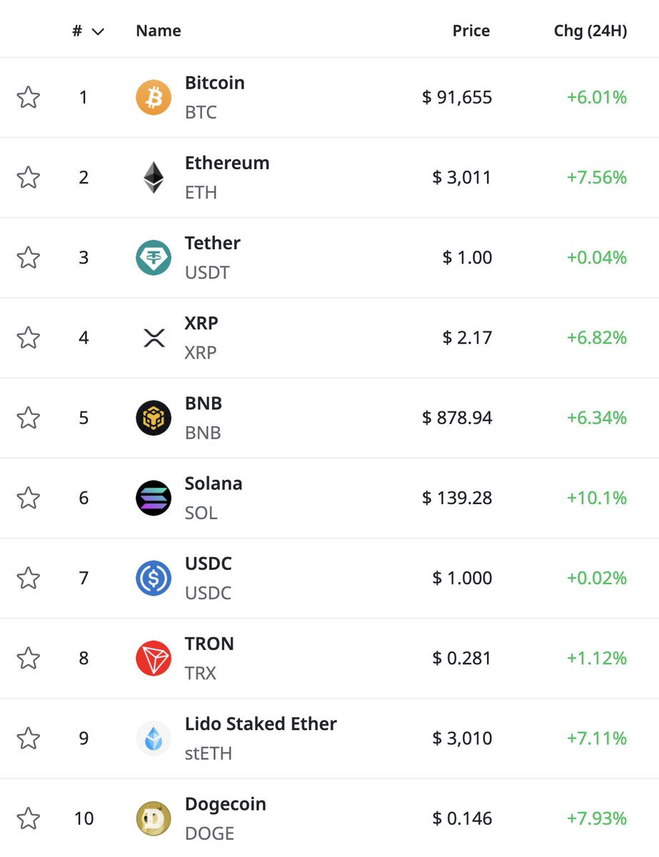 차트가 온통 초록불이고, 모멘텀이 돌아오면서 시장 전반의 자신감도 눈에 띄게 오르고 있습니다. 오늘 톱 10 자산 급등을 이끄는 주요 요인들을 정리해봤어요. 1. 비트코인(BTC) – $91,655 (+6.01%) BTC가 여전히 시장을 단단히 이끌고 있습니다. $91K를 뚫으면서 기관 수요가 다시 살아나고 현물 수요도 강해졌다는 신호예요. 비트코인의 우위는 전체 시장 분위기를 좌우하는 핵심 포인트입니다. 2. 이더리움(ETH) – $3,011 (+7.56%) ETH가 $3,000을 다시 회복했어요. 심리적, 기술적으로 중요한 구간입니다. L2 활성화도 높고, 스테이킹 참여도 꾸준해 네트워크 확장 다음 단계에 들어갈 준비를 하고 있습니다. 3. 테더(USDT) – $1.00 (+0.04%) 항상 안정적이고, 유동성도 풍부합니다. USDT는 글로벌 거래쌍과 자금 이동의 중심 역할을 하면서 시장이 24시간 계속 움직이게 해주는 존재입니다. 4. 리플(XRP) – $2.17 (+6...