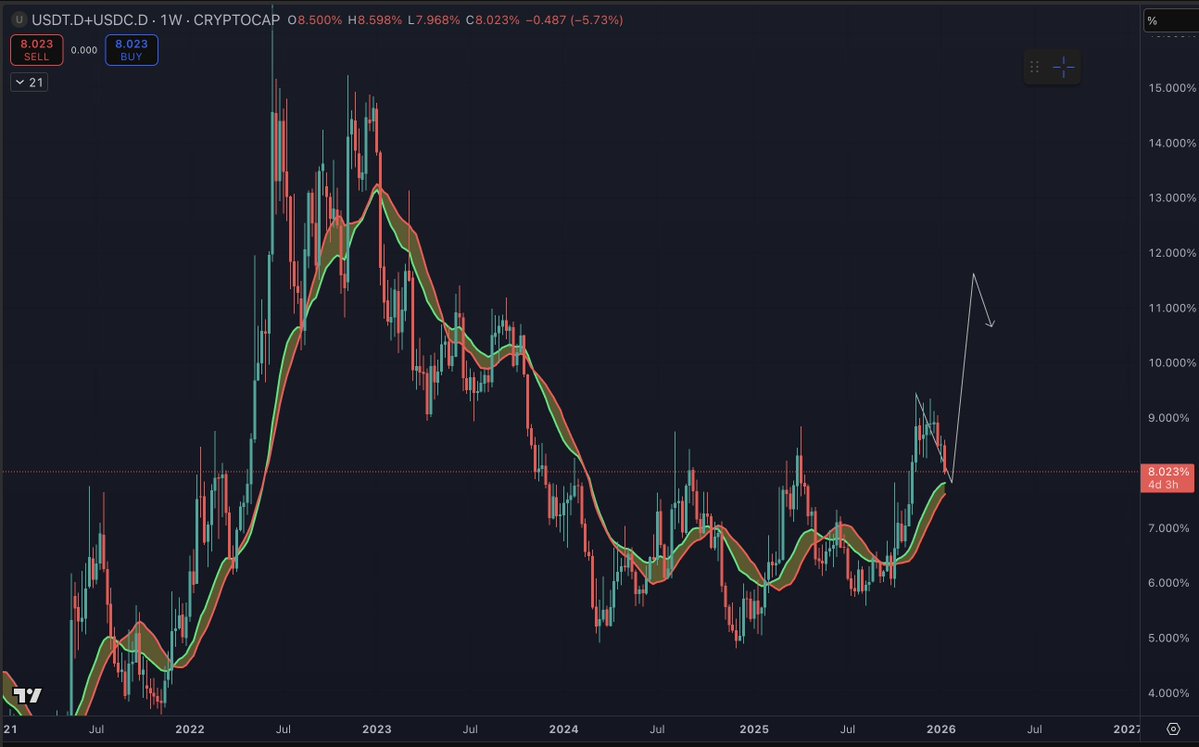 스테이블코인 도미넌스, 예상한 경로대로 가는 중... 2시간 전 중립적 4 0 0 BTC가 자기 불마켓 서포트 밴드로 달려가는 사이, 스테이블코인 도미넌스는 다시 불마켓 서포트 밴드까지 되돌림.물론 뭐든 가능하지만, 스테이블코인 도미넌스는 앞으로 몇 주간 안정화(횡보)했다가 이후에 더 위로 갈 확률이 높아 보임. 스크랩 0 공유 관련링크 https://twitter.com/intocryptoverse/status/2011545486038352385
