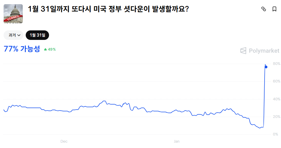 [속보] 1월 31일전에 미국이 셧다운 또 한다 뭔가 해외 애들은 알고 있는거 같다.. 갑자기 확률 77%까지 한방에 급등함 6일 남았는데 갑자기 셧다운 ?? 마켓메이커 · 4일 전 125 1 0