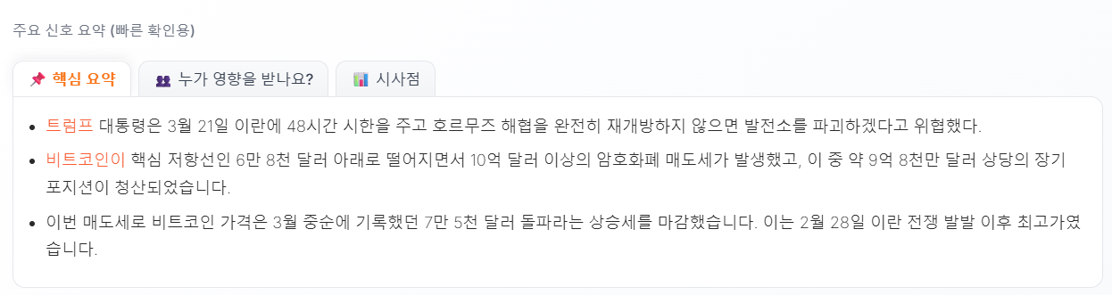 이란 결국에는 트럼프랑 합의할거 같지 않나요? 바로템 회원정보 보기 메시지 보내기 · 1시간 전 5 0 0 꼭 최후까지 버티다가 합의하던데 이번에도 그러지 않을까요? 코인 언제 매수하면 될까? 코인와이 AI차트가 알려줄게요! 차트보기 실시간 암호화폐 소식 인기글 레짐 체인지 제대로 시작됐네: 이란 전쟁 발발 이후 금 -13%, 비트코인 +6% 개인적으로 크로노스 차트 좋아보이네 세계 가스 공급량의 20% 담당하는 이란 시설 파괴 BTC 일봉에서 상승 웨지 형성 중 안전자산이 다 무너졌다. 코스피 전고점 살짝 넘고 죽을거같지 않음? 나스닥 왜 또 떡락중..? 비트코인 숏물량 사상최대치 과연 오늘도 잡알트만 약펌핑 메이저 알트 물려있는 형들이 개빡치겠네 ㅋㅋㅋ 스크랩 0 공유