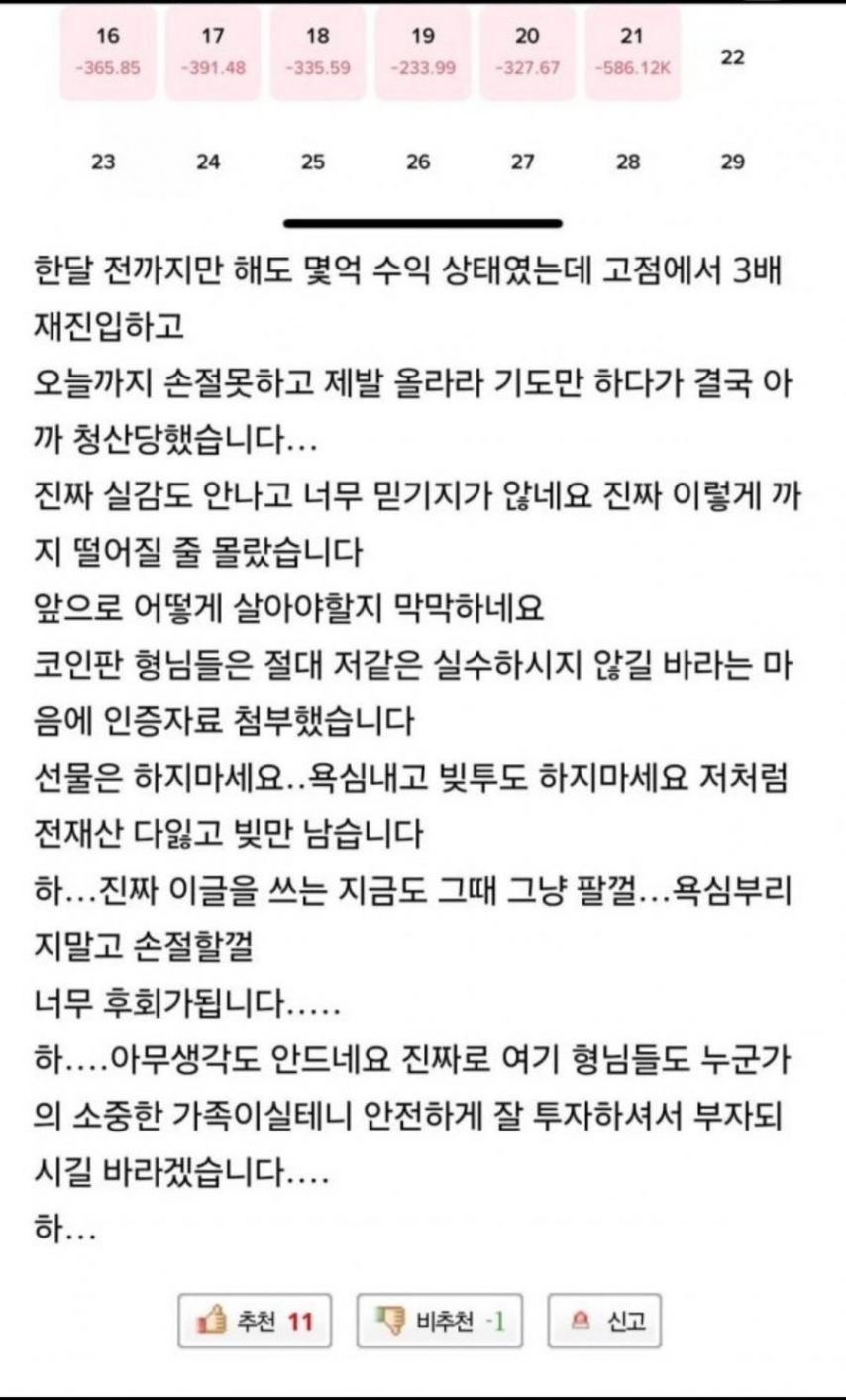 최근에 비트코인으로 10억 청산당한 사람 ㄷ 일론도지 회원정보 보기 메시지 보내기 · 1주 전 12 0 0 대출 2억받아서 총 시드 6억으로 10억 만들었는데 더하다가 결국 청산당함.. 스크랩 0 공유
