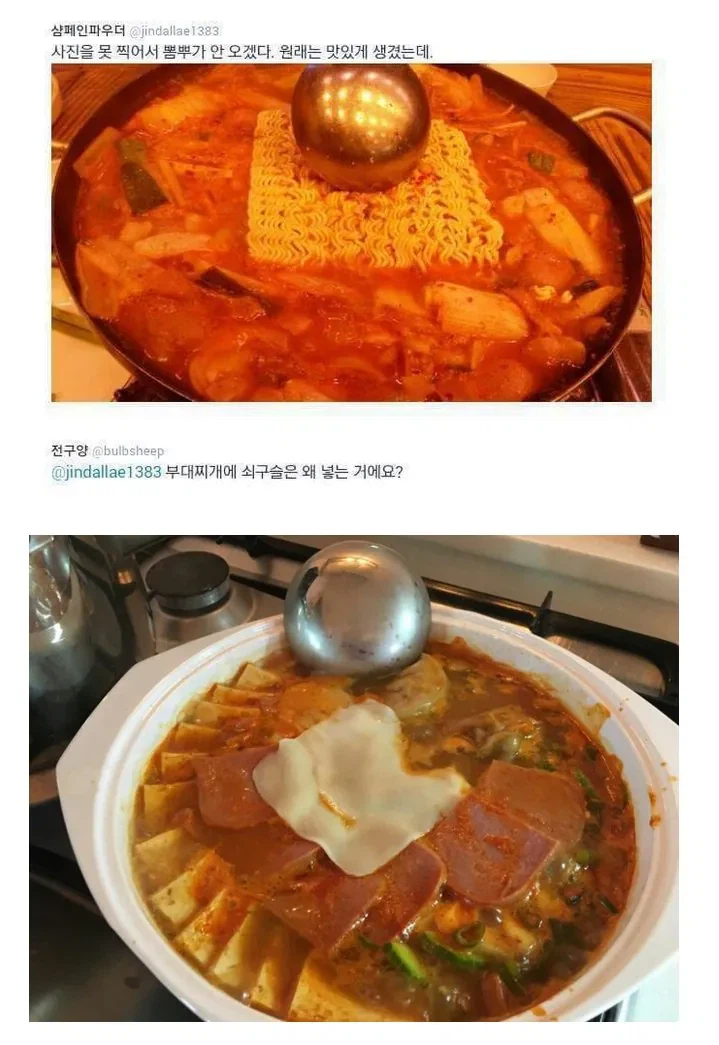 부대찌개에 꼭 넣어야 하는 재료.jpg 알트무새 회원정보 보기 메시지 보내기 · 2시간 전 14 0 0 200도 이상 달군 초고온의 쇠구슬을 넣어줘야 부대찌개 재료들이 마일라르드 반응(Maillard reaction)을 일으켜 풍미가 훨씬 살아남. 스크랩 0 공유