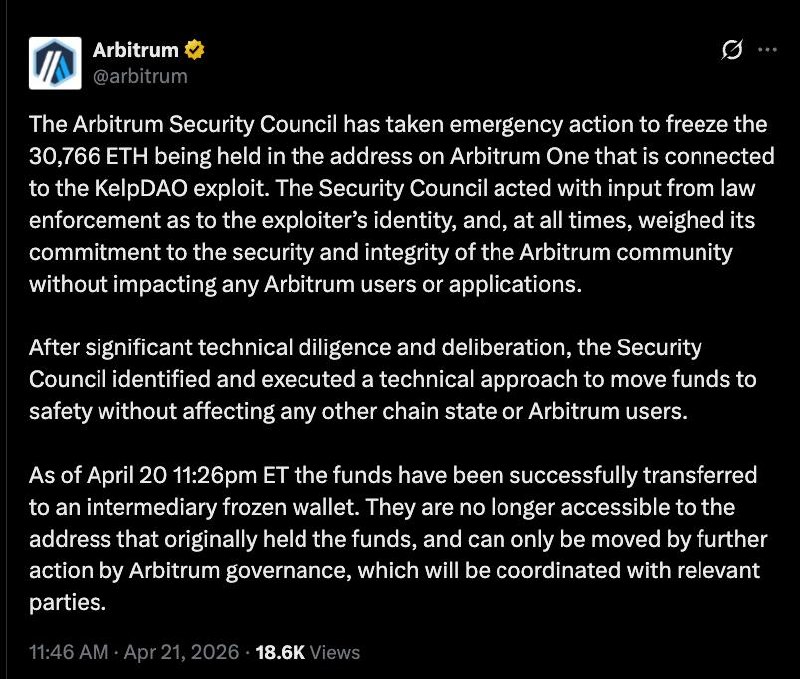 아비트럼의 보안 위원회가 KelpDAO 해킹 사건과 관련된 30,766 ETH를 동결했습니다. 이 자산은 해커가 접근할 수 없는 중개 지갑으로 이전되었습니다.